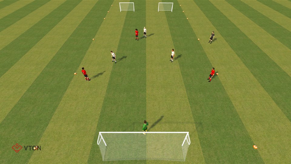 - Scoren doormiddel van de bal door één van de kleine goaltjes te dribbelen.